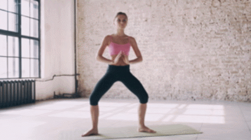 매트에 서서 다리를 넓게 벌려줍니다. 그리고 무릎을 구부리면서 엉덩이를 낮추고, 손을 가슴 앞으로 모아줍니다. 그런 다음 자세를 유지하면서 호흡하세요. 상체를 좌우로 움직이면서 옆구리를 늘이는 동작을 추가할 수 있습니다. 1분간 운동하세요.