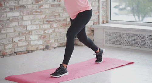 다리를 모으고 서서 시작하며, 왼쪽 다리를 앞으로 뻗으면서 런지 동작을 진행합니다. 손은 가슴 앞으로 모으고, 30초 동안 반복하세요. 이번에는 오른쪽 다리를 앞으로 뻗어서 런지 동작을 30초 이어갑니다. 시선은 정면을 향하세요.