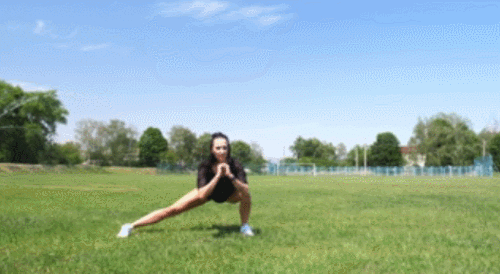 바닥에 서서 시작하며, 왼쪽 다리를 오른쪽 다리 뒤쪽으로 대각선 방향으로 뻗어서 리버스 런지 동작을 만듭니다. 그리고 돌아오면서 오른쪽 다리를 뻗는 사이드 런지 동작으로 연결하세요. 30초 반복 후, 다리의 위치를 바꿔서 30초 진행합니다.