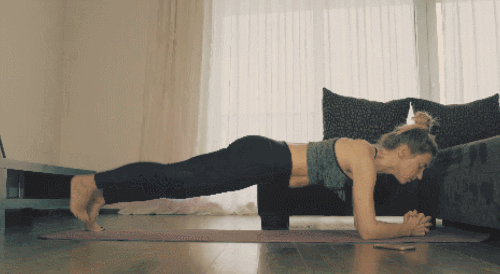 매트에 엎드린 상태에서 무릎을 대고 시작합니다. 그리고 팔꿈치를 구부리면서 몸을 바닥으로 전체적으로 내렸다가 원래 자세로 돌아오면, 되는데요. 시선은 바닥을 바라보면서 1분 동안 진행합니다.