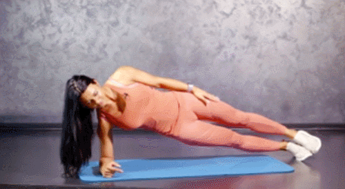 오른쪽 팔뚝을 대고 옆으로 누워서 엉덩이를 들고, 사이드 팔꿈치 플랭크 자세를 만드세요. 왼손은 옆구리에 붙이고, 자세를 유지하며 30초 동안 호흡합니다. 이번에는 반대편으로 돌아서 왼쪽 팔뚝으로 버티는 자세로 30초 운동하세요.