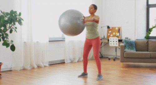 어깨너비보다 넓게 다리를 벌리고 서서 손에는 짐볼을 잡습니다. 그리고 무릎을 구부리고, 엉덩이를 바닥으로 내리면서 스쿼트 동작을 진행하세요. 상체는 꼿꼿하게 세우고, 시선은 정면을 응시합니다. 1분간 반복하세요.
