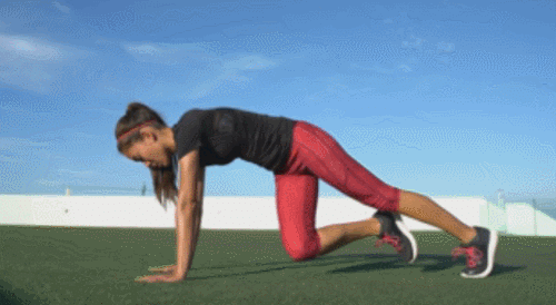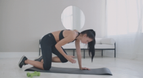매트에 네발기기 자세로 엎드려서 준비하세요. 그리고 오른팔을 앞으로 뻗으면서 왼발을 뒤로 뻗어줍니다. 그런 다음 복부를 향해 당겼다가 다시 펴주면 되는데요. 30초 운동 후, 반대편 팔과 다리로 30초 반복합니다.