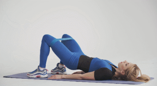 허벅지 사이에 밴드를 끼우고, 바닥에 누워서 준비하세요. 무릎을 당기고, 발을 바닥에 붙이세요. 그리고 엉덩이를 들면서 브릿지 자세를 만들고, 다리를 오므렸다가 벌리는 동작을 추가합니다. 업다운 동작과 함께 1분간 반복하세요.