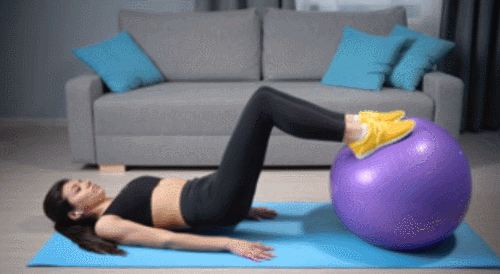 짐볼을 활용하여 브릿지 운동을 진행할 수 있는데요. 다리를 짐볼 위에 올리고 매트에 누워서 시작하세요. 그리고 엉덩이를 들어서 브릿지 동작을 만듭니다. 최대한 버텼다가 원래 자세로 돌아옵니다. 1분간 운동하세요.