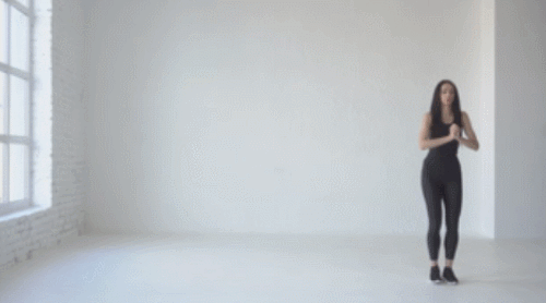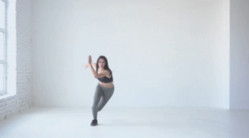 바닥에 서서 손을 가슴 앞으로 모아줍니다. 그리고 무릎을 약간 구부립니다. 그런 다음 오른쪽 다리를 오른쪽으로 이동하면서 움직이세요. 이번에는 왼쪽 다리를 왼쪽 방향으로 이동합니다. 사이드 워크 동작을 1분간 진행하세요.