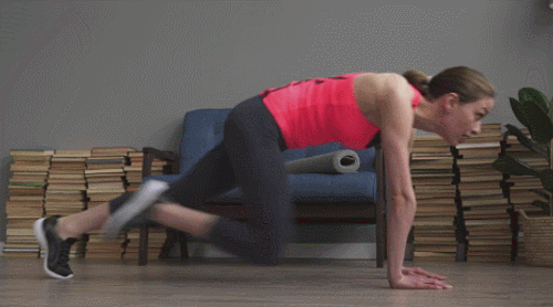 매트에 엎드린 상태로 플랭크 기본자세로 시작합니다. 그리고 왼쪽 다리를 당겼다가 되돌리는 동시에 오른쪽 다리를 당겼다가 되돌립니다. 다리를 번갈아 당겨주면 되는데요. 빠르게 움직이면서 1분간 운동하세요.