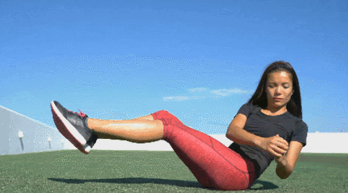 매트에 엉덩이를 대고 앉고, 상체를 뒤로 젖히면서 다리를 공중으로 띄우세요. 그리고 무릎을 구부립니다. 그런 다음 손을 복부 앞으로 모으고, 상체를 왼쪽으로 틀었다가 돌아와서 오른쪽으로 틀어줍니다. 상체를 좌우로 움직이면서 1분간 운동하세요.