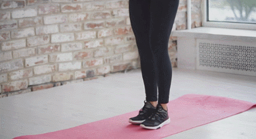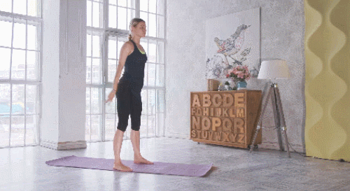 어깨너비보다 조금 더 넓게 다리를 벌리고 서서 준비하세요. 그리고 무릎을 구부리면서 스쿼트 동작을 진행합니다. 손은 가슴 앞으로 모았다가 일어서면서 뻗어주세요. 시선은 정면을 유지하고, 1분 동안 반복합니다.