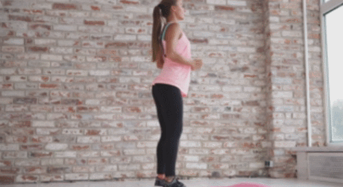 매트에 어깨너비보다 넓게 다리를 벌리고 서서 시작하세요. 엉덩이를 바닥으로 충분히 내리면서 스쿼트 동작을 진행합니다. 이때 손을 가슴 앞으로 모으고, 원래 자세로 돌아오면서 옆구리로 이동합니다. 1분간 반복하세요.
