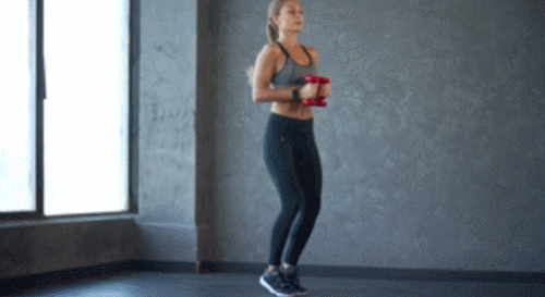 손에 아령을 들고 바닥에 서서 준비하세요. 그리고 점프 동작과 함께 다리를 벌리고, 엉덩이를 내리면서 스쿼트 동작을 진행합니다. 이때 아령을 가슴 앞으로 모아줍니다. 일어서면서 점프하여 다리를 모아주세요. 1분간 반복합니다.