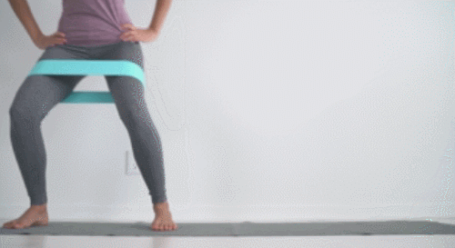 허벅지에 밴드를 끼우면, 운동 효과를 높일 수 있는데요. 무릎을 구부린 상태를 유지하고, 왼쪽 다리를 왼쪽으로 이동하세요. 이번에는 오른쪽으로 이동합니다. 움직이는 폭을 조절하면서 1분 동안 좌우로 움직이세요.