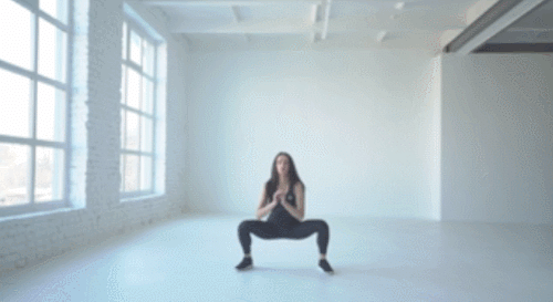 다리를 어깨너비보다 넓게 벌리고 서서 시작하세요. 그리고 엉덩이를 낮추면서 스쿼트를 진행합니다. 그런 다음 완전히 일어나지 않고, 1회 더 진행하세요. 이번에는 상체를 일으키면서 점프 동작을 추가합니다. 1분 동안 진행하세요.