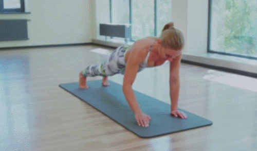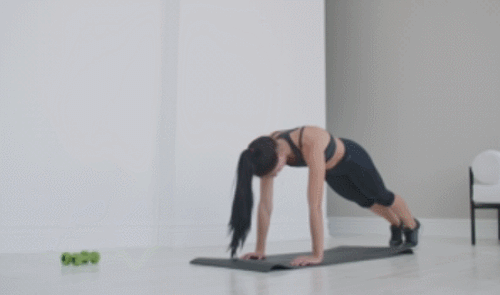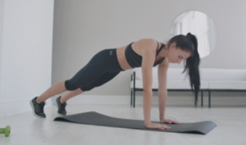 플랭크 기본자세로 매트에 엎드리세요. 그리고 오른쪽 팔꿈치를 구부리고, 왼쪽 팔꿈치를 구부려서 팔꿈치 플랭크 자세로 전환하세요. 그런 다음 팔꿈치를 펴면서 다시 원래 자세로 돌아오면, 1회가 완료됩니다. 1분간 운동하세요.
