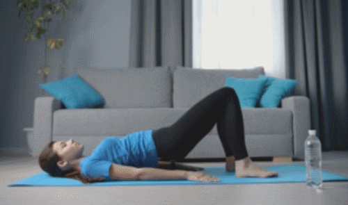 매트에 등을 대고 누운 상태에서 다리를 바닥에 고정합니다. 그리고 팔을 바닥으로 누르면서 엉덩이를 공중으로 들었다가 내리는 브릿지 업다운 동작을 진행합니다. 1분 동안 운동하고, 몸이 사선이 되도록 만듭니다.