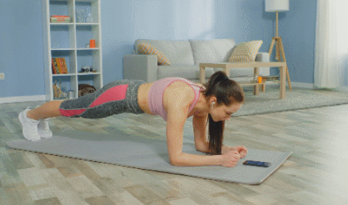 매트에 팔뚝을 대고 엎드리는 팔꿈치 플랭크 자세로 시작하세요. 몸을 곧게 뻗고, 시선은 바닥을 향합니다. 자세를 유지하면서 최대한 버틴 후, 플랭크 기본자세로 돌아옵니다. 1분 동안 버티는 자세를 반복하세요.