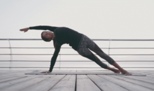 플랭크 기본자세에서 오른손으로 버티면서 상체를 틀고, 왼손을 공중으로 뻗습니다. 사이드 플랭크 자세를 만들면 되는데요. 자세를 유지하면서 호흡하고, 30초 동안 버티세요. 이번에는 반대편으로 자세를 바꿔서 30초 진행합니다.