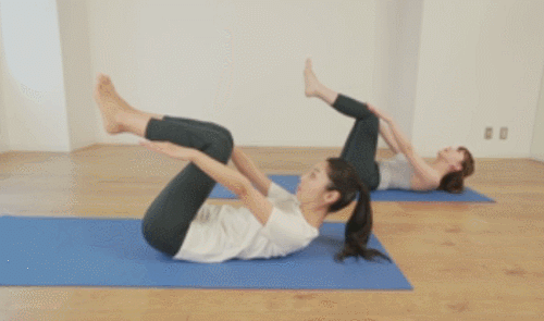 매트에 등을 대고 누운 상태에서 다리를 공중으로 들어줍니다. 그리고 무릎을 구부리세요. 그런 다음 상체를 일으키고, 팔을 공중으로 뻗으세요. 자세를 유지하면서 복부에 힘을 주고, 1분 동안 버팁니다.