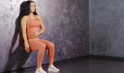 벽 앞에 서서 시작하세요. 등을 벽에 기대고, 무릎을 구부리면서 스쿼트 자세를 만듭니다. 그리고 다리를 벌렸다가 오므리는 동작을 추가하세요. 1분 동안 자세를 유지하면서 버티면 되는데요. 시선은 정면을 바라봅니다.