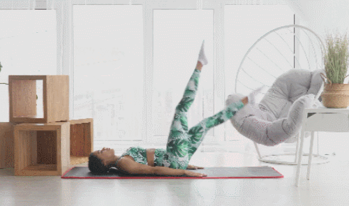 매트에 등을 대고 누운 상태에서 시작합니다. 그리고 복부에 힘을 주고, 다리를 공중으로 띄우세요. 그런 다음 오른쪽 다리를 바닥으로 내렸다가 드는 동시에 왼쪽 다리를 바닥으로 내리세요. 다리를 교차하면서 1분간 운동합니다.