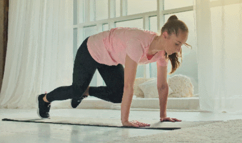 매트에 엎드려서 플랭크 기본자세를 만드세요. 그리고 왼쪽 다리를 당겼다가 되돌리면서 오른쪽 다리를 당겨주세요. 다리를 점차 빠르게 교차하면서 움직이면 되는데요. 시선은 바닥을 향하고, 1분 동안 진행합니다.
