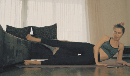 왼쪽 팔뚝을 대고 옆으로 누워서 시작합니다. 그리고 왼쪽 다리는 바닥에 붙이고, 오른쪽 다리를 들었다가 내리는 동작으로 30초 진행하세요. 그런 다음 반대편으로 눕고, 왼쪽 다리를 드는 동작으로 30초 반복합니다.