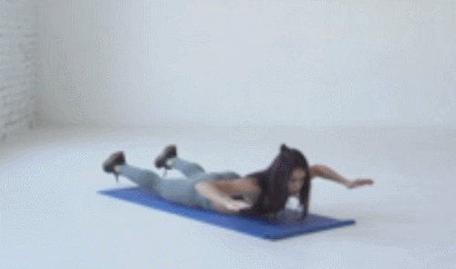 매트에 엎드린 상태에서 팔을 앞으로 뻗습니다. 그리고 다리를 어깨너비로 벌리세요. 그런 다음 상체와 하체를 동시에 공중으로 들고, 슈퍼맨 자세를 만듭니다. 최대한 버틴 후, 원래 자세로 돌아오세요. 1분간 반복합니다.
