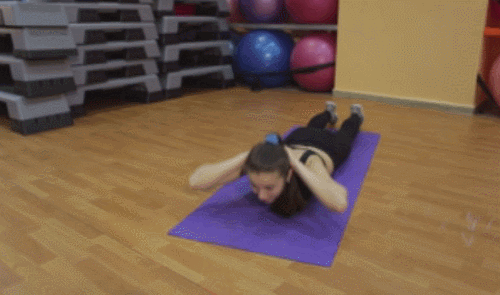 매트에 엎드린 상태로 손을 머리 뒤로 보내서 깍지 껴 잡습니다. 그리고 상체를 공중으로 들었다가 내리는 동작을 반복하면 되는데요. 하체는 바닥에 붙인 상태로 1분 동안 상체를 드는 동작을 반복합니다.