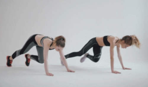 매트에 엎드린 상태로 플랭크 기본자세에서 시작하세요. 그리고 왼쪽 무릎을 오른쪽 팔꿈치로 당겼다가 되돌리면서 오른쪽 무릎으로 반복합니다. 속도를 점차 높이면서 빠르게 반복하세요. 시선은 바닥을 향하고, 1분간 운동합니다.