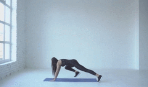 플랭크 자세로 엎드려서 준비하세요. 그리고 왼쪽 무릎을 당겼다가 되돌리고, 오른쪽 무릎을 당기는 동작으로 연결합니다. 시선은 바닥을 응시하고, 팔꿈치는 구부러지지 않도록 합니다. 1분 동안 운동하세요.