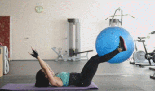 매트에 눕고, 다리 사이에 짐볼을 끼웁니다. 그리고 다리를 공중으로 들면서 짐볼을 손으로 옮기세요. 다시 다리를 공중으로 들고, 손에 있는 짐볼을 옮겨줍니다. 1분 동안 짐볼을 이동하면서 운동을 반복하세요.