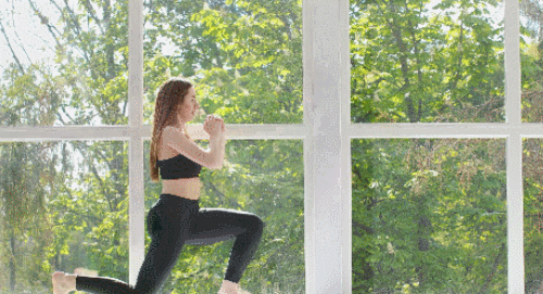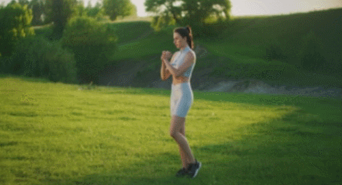 다리를 모으고 바닥에 서서 시작합니다. 그리고 손은 가슴 앞에서 잡아주세요. 그런 다음 오른쪽 다리를 뒤로 내딛고, 무릎을 90도 각도로 구부리면서 런지 자세를 만듭니다. 그런 다음 다리를 당기면서 킥 동작으로 연결하세요. 30초 반복 후, 반대편 다리로 30초 진행합니다.