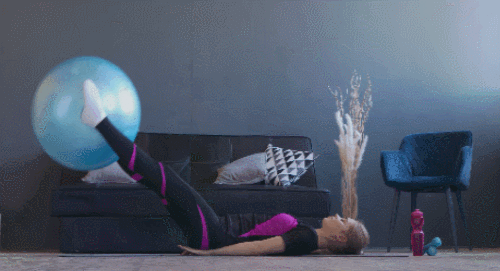 매트에 누운 후, 다리 사이에 짐볼을 끼웁니다. 그리고 다리를 공중으로 천천히 들었다가 내리는 레그레이즈 동작을 1분 동안 진행하면 되는데요. 하루 100개를 채울 수 있도록 나눠서 운동합니다.