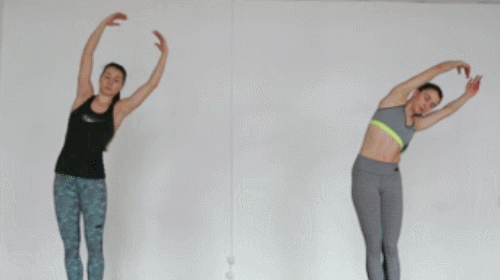 바닥에 어깨너비로 다리를 벌리고 서서 시작합니다. 손을 머리 위로 올리고, 원 모양을 만드세요. 그리고 왼쪽 방향으로상체를 내리면서 시계 방향으로 원을 그립니다. 이번에는 반대 방향으로 반복하세요. 1분 동안 좌우로 운동합니다.