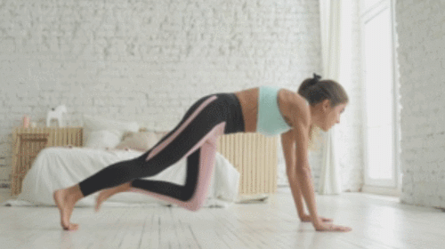 플랭크 자세로 매트에 엎드려서 준비하세요. 그리고 왼쪽 무릎을 당겼다가 되돌리면서 오른쪽 다리를 당겨주는 동작으로 연결합니다. 1분 동안 다리를 번갈아 움직이면 되는데요. 시선은 바닥에 고정하고, 팔꿈치는 펴주세요. 100개를 채웁니다.