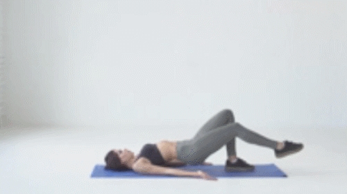 매트에 누운 상태에서 무릎을 당겨서 세웁니다. 그리고 오른쪽 다리를 앞으로 뻗어줍니다. 그런 다음 엉덩이를 들면서 오른쪽 무릎을 당겼다가 내리면서 다시 뻗으세요. 30초 운동 후, 반대편 다리로 30초 반복합니다. 100개를 목표로 운동하세요.