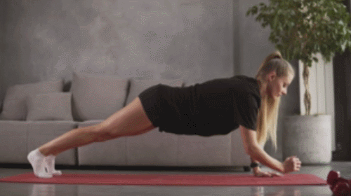 플랭크 자세로 엎드려서 준비하세요. 그리고 오른쪽 팔꿈치를 구부리고, 왼쪽 팔꿈치를 구부려서 팔꿈치 플랭크 자세로 전환합니다. 다시 팔꿈치를 펴고 원래 자세로 돌아오면, 1회가 완료됩니다. 1분 동안 업다운 동작을 진행하세요.