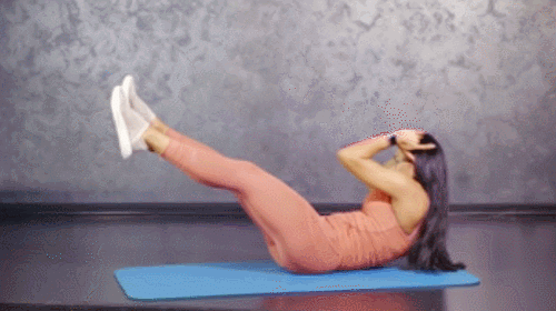 매트에 누운 상태에서 손을 머리 위로 뻗습니다. 그리고 다리를 당기면서 상체를 일으켰다가 원래 자세로 돌아갑니다. 무릎은 구부리고, 팔은 앞으로 당겨서 몸 전체를 V로 만드세요. 1분 동안 반복합니다.