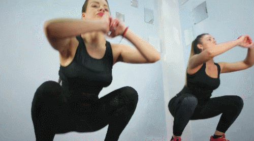 어깨너비보다 넓게 다리를 벌리고 서서 시작하세요. 그리고 무릎을 구부리면서 스쿼트 동작을 진행합니다. 그런 다음 일어서면서 오른쪽 무릎을 왼쪽 대각선 방향으로 들었다가 내리면서 스쿼트 동작으로 연결합니다. 다리를 바꿔가며 1분간 운동하세요.
