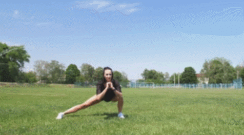 정면에 서서 왼쪽 다리를 왼쪽 방향으로 넓게 이동하면서 오른쪽 다리를 펴줍니다. 그리고 원래 자세로 돌아가면서 왼쪽 다리를 오른쪽 다리 뒤로 대각선 런지를 진행하세요. 30초 진행 후, 반대편 다리로 동일하게 30초 반복하세요.