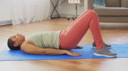 매트에 누운 상태에서 무릎을 세우고, 발을 바닥에 고정합니다. 그리고 팔을 바닥으로 누르면서 엉덩이를 들어서 브릿지 자세를 만들었다가 돌아오세요. 브릿지 업다운 동작을 1분 동안 천천히 진행합니다.