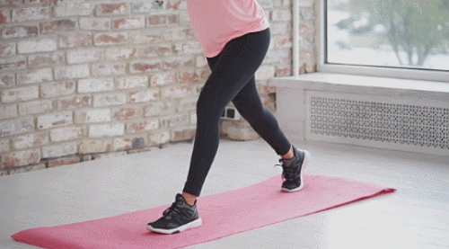 바닥에 서서 왼쪽 다리를 앞으로 뻗습니다. 그리고 무릎을 90도 각도로 구부리면서 런지 동작을 진행하세요. 손은 가슴 앞에서 모으고, 30초 동안 반복합니다. 그런 다음 다리의 위치를 바꿔서 30초 반복하세요.