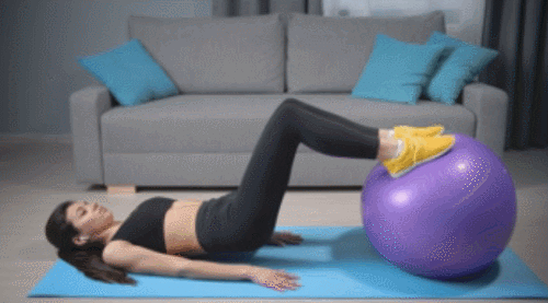 매트에 누운 상태에서 다리를 짐볼 위에 올립니다. 그리고 엉덩이를 들어서 브릿지 자세를 만들면 되는데요. 엉덩이를 바닥으로 내렸다가 드는 동작을 반복합니다. 균형을 유지하면서 1분 동안 운동하세요.
