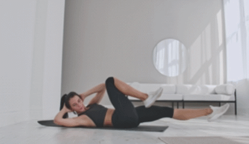 매트에 누운 상태로 손을 머리 옆으로 옮깁니다. 그리고 왼쪽 다리를 당기면서 상체를 일으켜서 오른쪽 팔꿈치를 가져갑니다. 그런 다음 오른쪽 다리를 당기면서 왼쪽 팔꿈치를 가져가는 동작으로 이어가세요. 1분간 반복합니다.