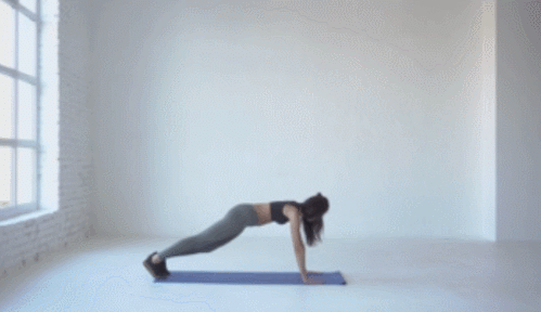 매트에 엎드려서 플랭크 기본자세를 만들고, 시선은 바닥을 응시하세요. 팔은 완전히 펴서 팔꿈치가 구부러지지 않도록 합니다. 그리고 왼발을 당겼다가 되돌리고, 오른발을 당겼다가 되돌립니다. 1분 동안 다리를 움직이세요.