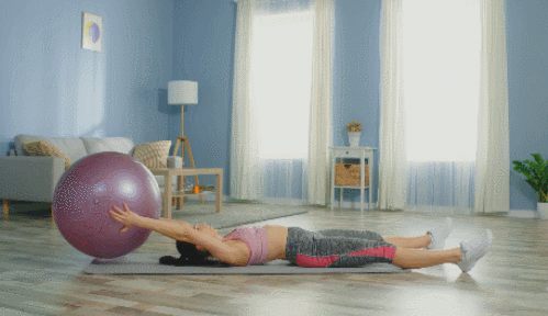 매트에 누운 상태에서 다리 사이에 짐볼을 끼우고, 힘을 주면서 움직이지 않도록 합니다. 그리고 다리를 공중으로 들어주는 동작을 진행하면서 상체를 함께 일으키세요. 그런 다음 다리의 짐볼을 손으로 옮깁니다. 다시 손의 짐볼을 다리로 옮기면, 1회가 완료됩니다. 1분간 반복하세요.