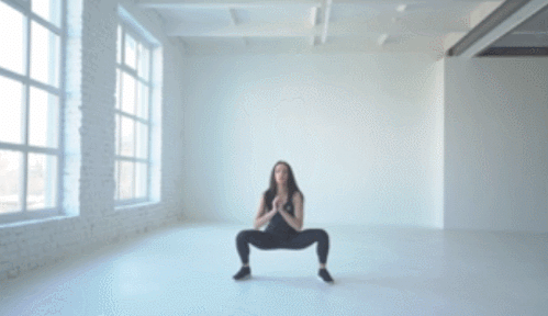 다리를 넓게 벌리고 바닥에 서서 준비합니다. 그리고 무릎을 구부리면서 와이드 스쿼트 자세를 진행합니다. 그런 다음 일어서면서 점프 동작과 함께 몸을 공중으로 띄웠다가 내리면서 스쿼트 동작으로 연결합니다. 팔은 올렸다가 내리면서 운동합니다. 1분간 진행하세요.