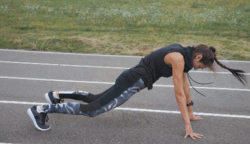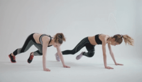 매트에 플랭크 기본자세로 엎드려서 준비하세요. 그리고 점프 동작과 함께 다리를 손목 방향으로 당겨줍니다. 그런 다음 점프 동작과 함께 원래 자세로 돌아가면 되는데요. 팔꿈치를 펴고, 시선은 바닥을 향하며, 1분 동안 반복합니다.