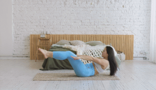 매트에 엉덩이를 대고 앉은 상태에서 상체를 천천히 뒤로 눕습니다. 그리고 다리는 공중으로 뻗어주세요. 팔도 함께 뻗어줍니다. 그런 다음 상체를 일으키면서 다리를 당겼다가 몸을 펴줍니다. 1분 동안 V업 변형 동작을 진행하세요.