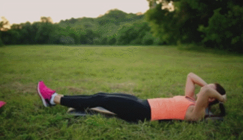 매트에 누운 상태에서 다리를 공중으로 올려서 바닥과 90도 각도가 되도록 만듭니다. 그리고 팔은 옆으로 펼칩니다. 그런 다음 상체를 일으키면서 손을 당겨서 공중으로 뻗었다가 원래 자세로 돌아갑니다. 1분 동안 반복하세요.